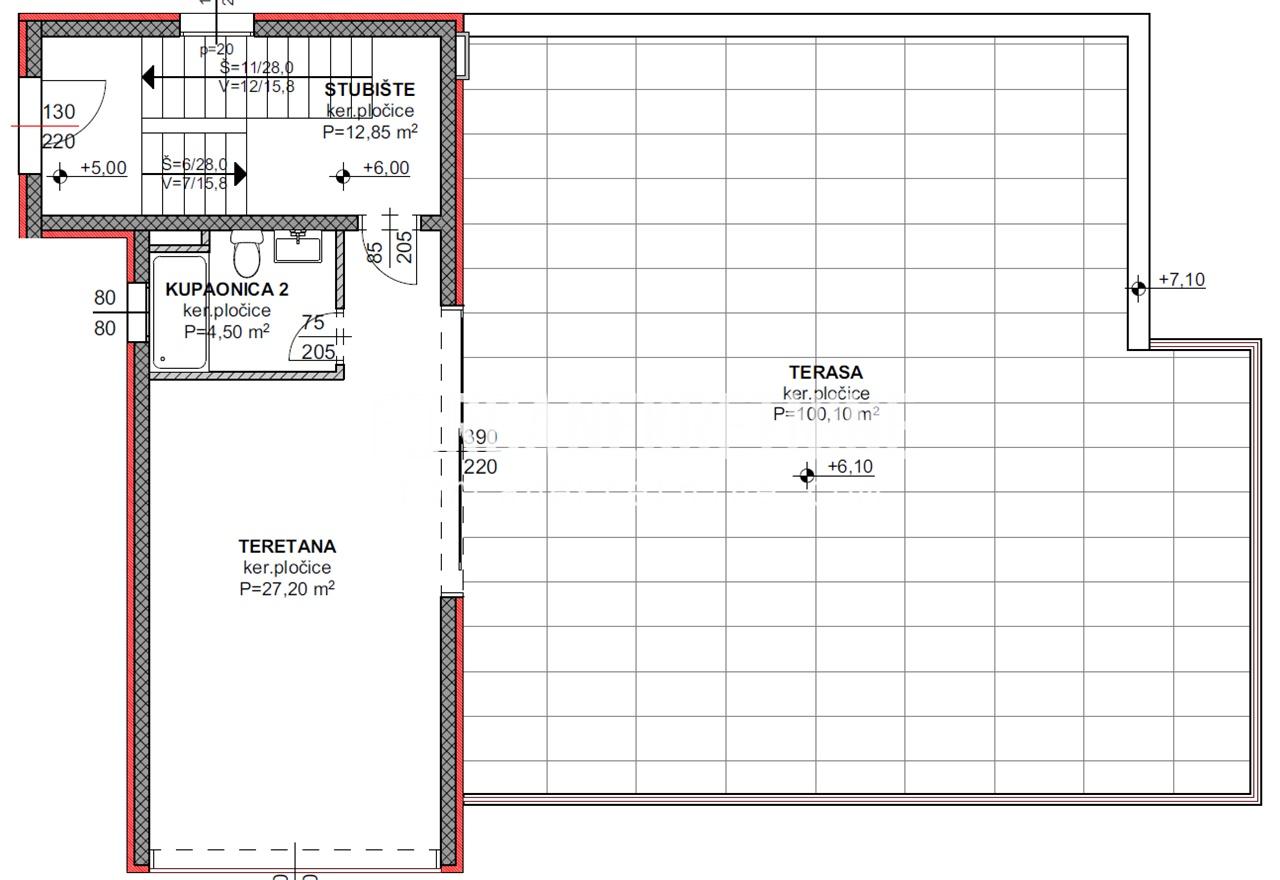Na 2. katu vile površine 69,57 m2 (44,55 m2 stambene površine + 25,02 m2 terasa) koji je s 1. katom vile povezan unutarnjim stepeništem nalazi se teretana s kupaonicom i velika terasa površine 100,10 m2 s pogledom na more i planinu.
