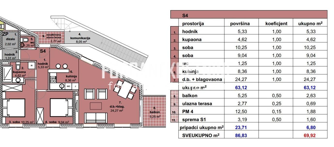 Nekretnini pripada vanjsko parkirno mjesto, ulazna terasa i dvije ostave (jedna u prizemlju objekta i druga do ulaza u stan). Dokumentacija uredna.